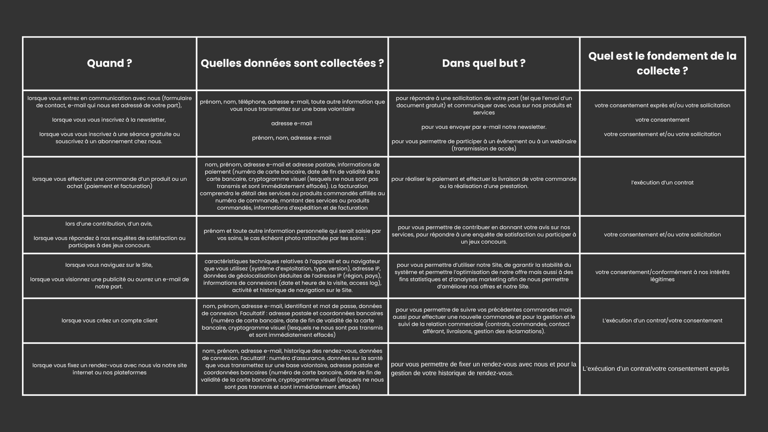 Seules les données strictement nécessaires au but poursuivi sont collectées. En refusant de nous transmettre certaines données, nous pourrions être empêchés de réaliser correctement les services demandés.